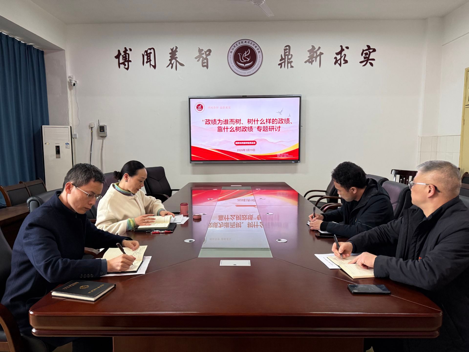 研讨交流环节,学院领导班子成员结合分管工作逐一发言,明确践行正确政绩观的实践路径:党总支书记何芳强调,要以师生为出发点、以学院长远发展为落脚点,以“薪火传媒”党建传播矩阵为重要载体,深化党建与新闻传播专业深度融合。聚焦中国传统文化、社会主义先进文化、红色文化与红色校史等内容传播,打造特色鲜明的“党建+传媒”品牌,完成五大载体的统一命名与精准定位,推动学院党建工作提质增效、打造亮点标杆,以改革之力促进党建与事业发展深度融合。