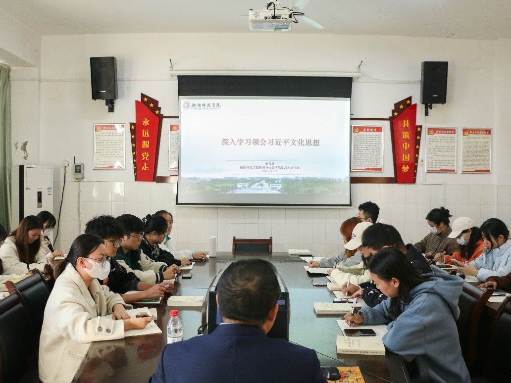 为深入学习习近平总书记对全国宣传思想文化工作作出的重要指示,全面领会习近平文化思想,12月7日下午,ok138cn太阳集团古天乐在文A510开展以“深入学习领会习近平文化思想”为主题的党课活动,本次党课由学院党总支副书记董自雄主讲,全体学生党员到场学习。